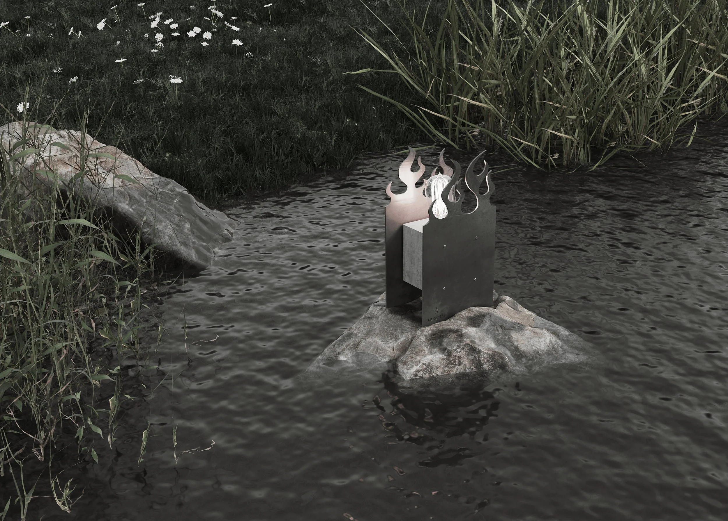 STASIS translates the volatile geometry of flame into steel. Cut silhouettes rise in the language of combustion yet remain permanently fixed. A gesture associated with instability is formalized; movement becomes structure.