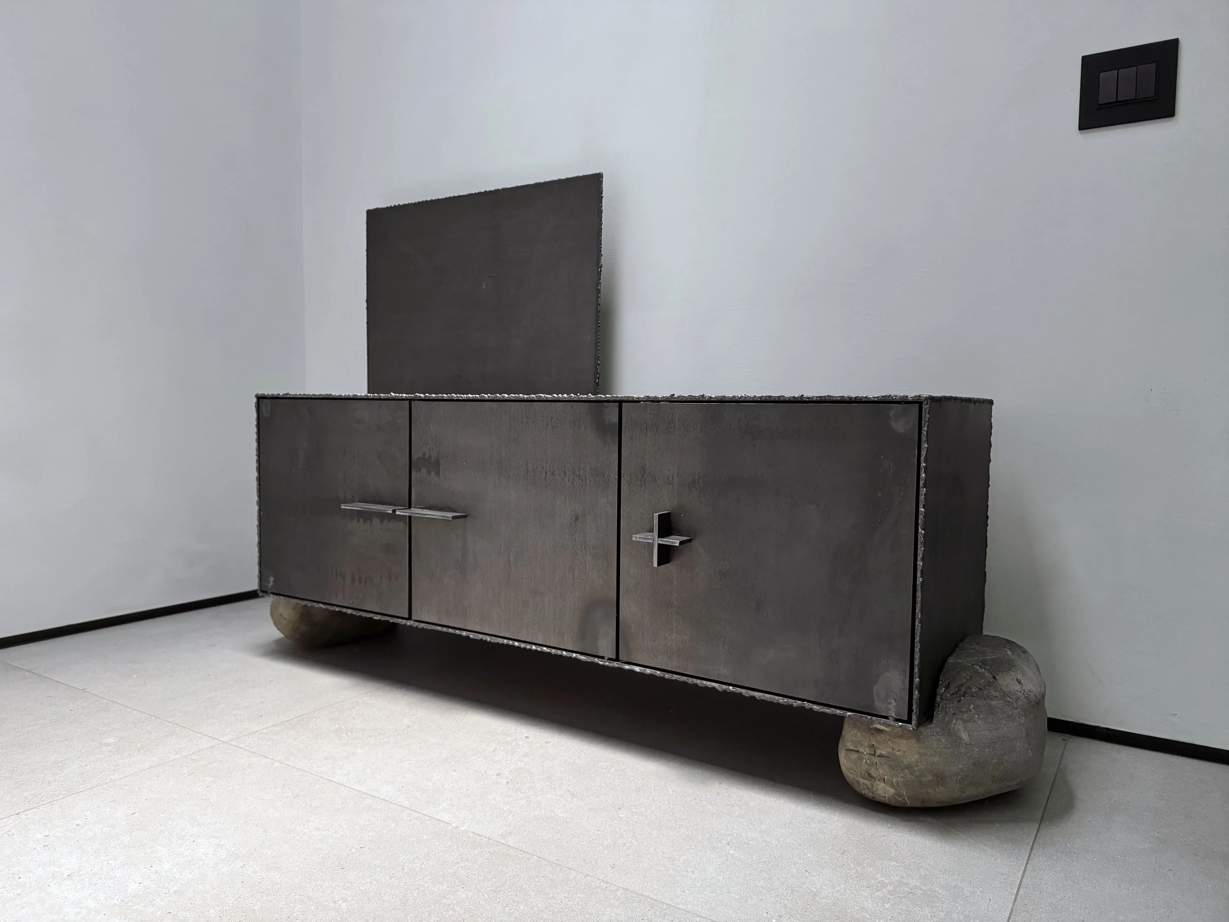 MASS is conceived as a horizontal volume stabilized by weight. A rectilinear steel body rests on irregular stone supports, elevating the unit while reinforcing its physical gravity. The object does not conceal its load; it asserts it.