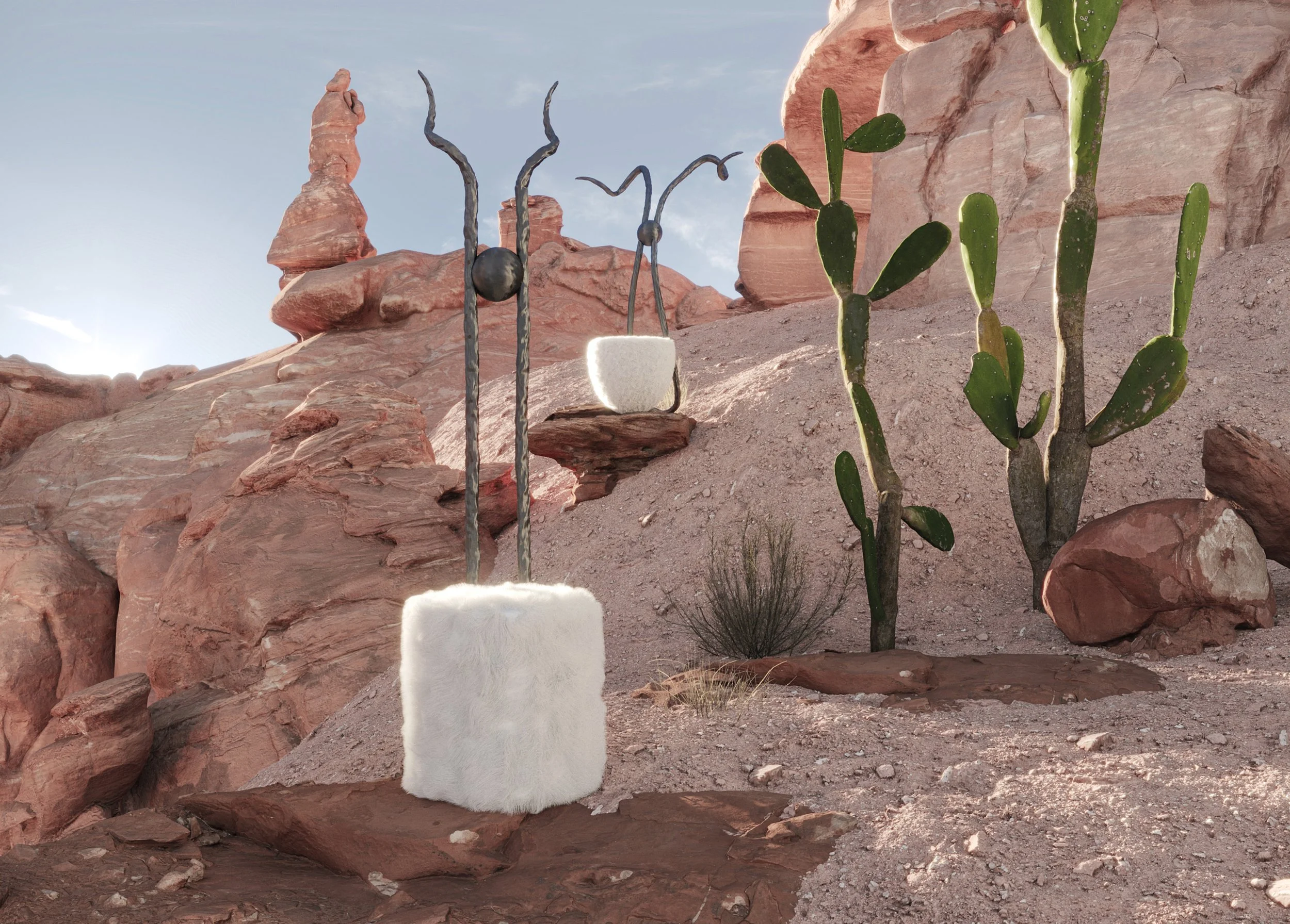 The elongated backs operate as directional vectors - lines extended into space rather than ornamental forms. Below, the upholstered volumes introduce density and tactile mass, counterbalancing the vertical thrust. Forged steel and soft textile coexist as opposing forces held in equilibrium.